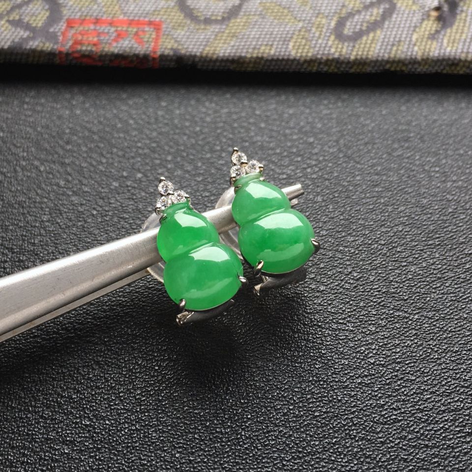 首页 >> (超值推荐)糯冰种翠色镶白金钻石葫芦耳夹一对