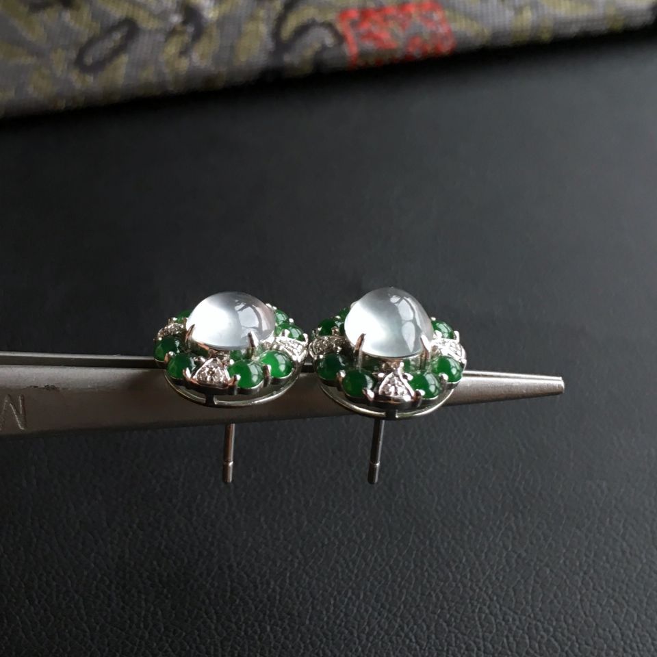 冰种淡晴水镶白金钻石耳钉一对