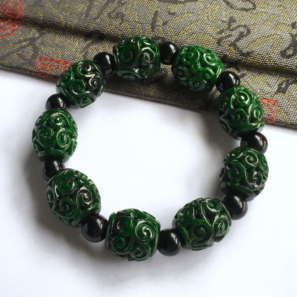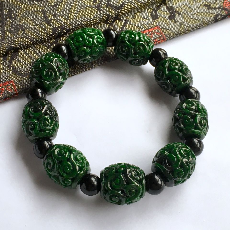 【描述】:细糯种浓绿仿古路路通手链,玉质细腻温润,整体色泽浓郁鲜明,路路通大小均匀,雕刻仿古纹路,佩戴于腕间尽显古色古香。【尺  寸】共9颗,每颗约:直径14.7mm 宽16.3mm