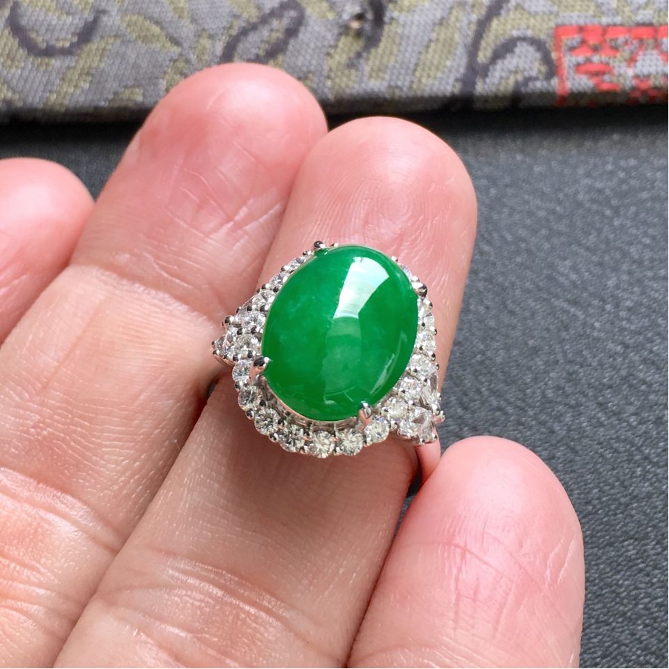 首页 >> (超值推荐)糯冰种阳绿镶白金钻石戒指