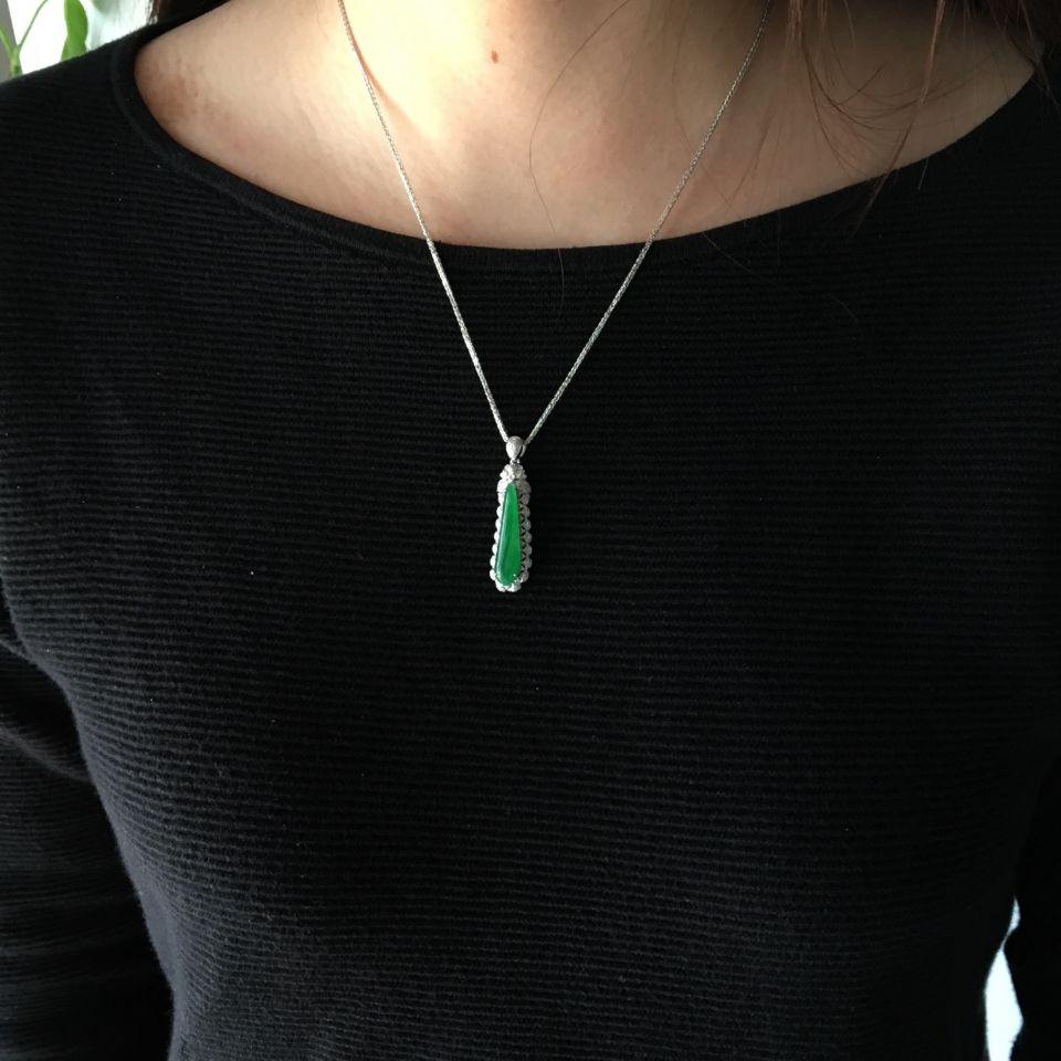 糯冰种阳绿镶白金钻石水滴胸坠