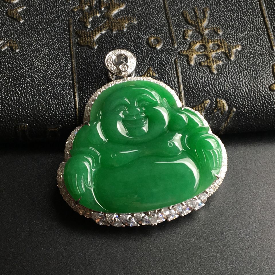 糯冰种翠色镶白金钻石玉佛胸坠