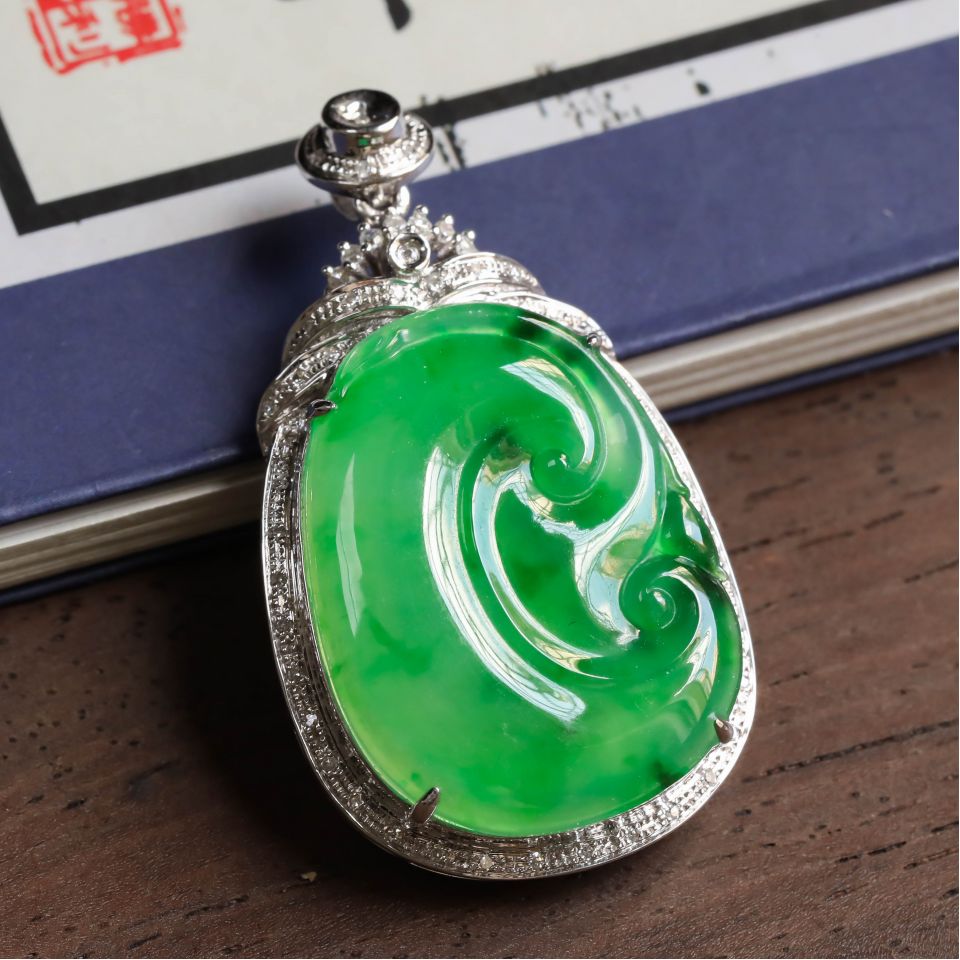 首页 >> (一口价扫货)镶白18K金钻石冰种翠色如意胸坠