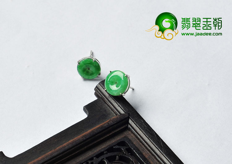 糯冰种阳绿满绿缅甸翡翠A货镶白金耳钉
