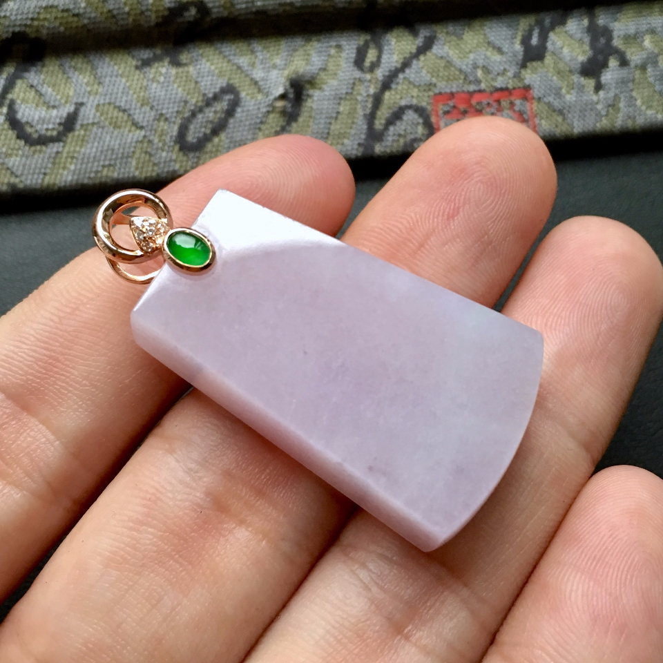 【描述】:细糯种紫罗兰方牌胸坠(金扣),质地温润,裸石厚实方正,紫罗兰色泽有点淡但分布均匀,18k金扣头,搭配冰绿顶珠点缀。尺寸:裸石34*20.2*10mm