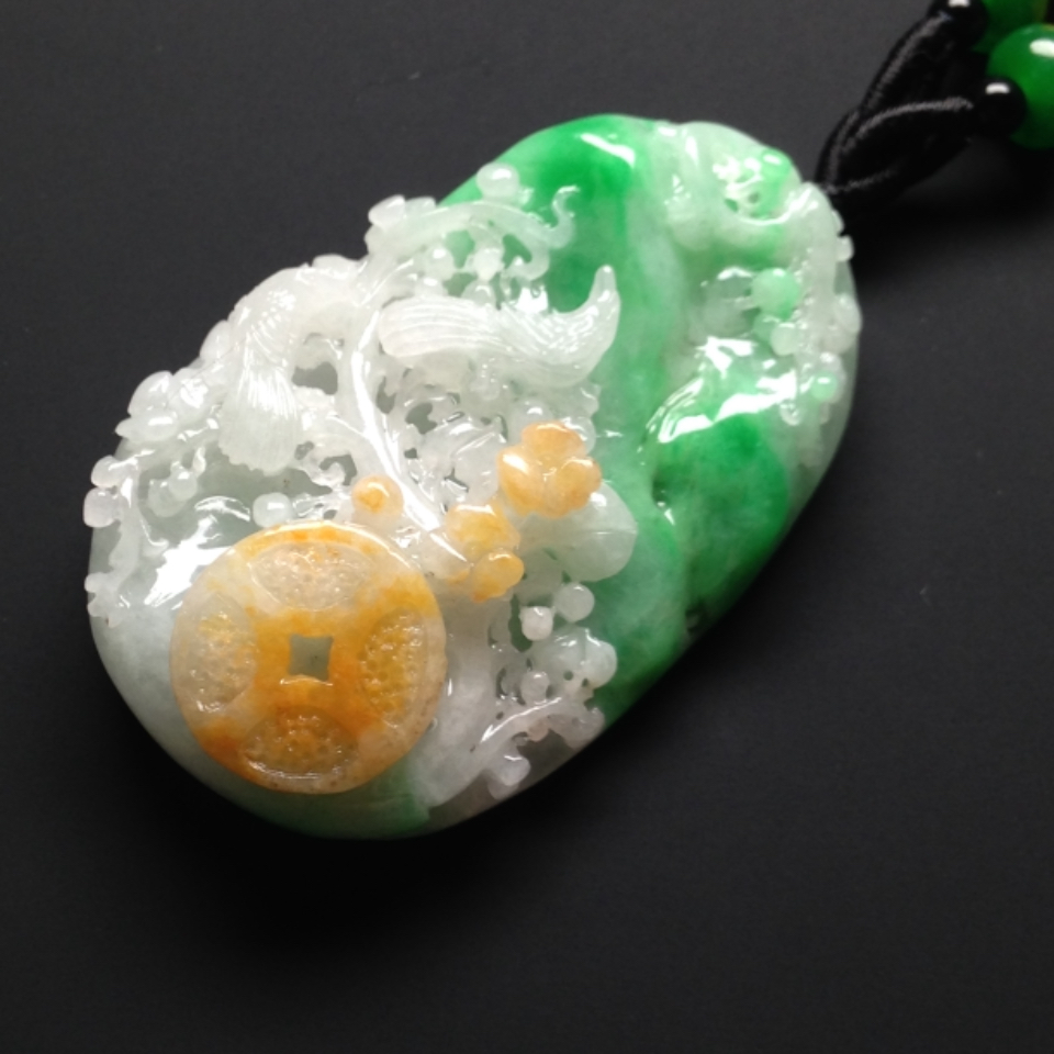 【描述】:色彩艳丽,黄绿白三色分明,雕工精湛,立体感强,品相佳,玉质细腻