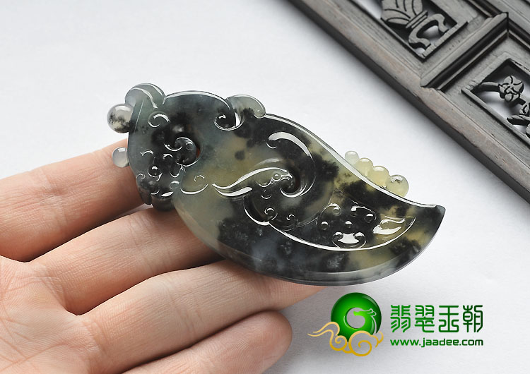 冰(乌鸡种)水墨色缅甸翡翠A货仿古龙凤呈祥挂件