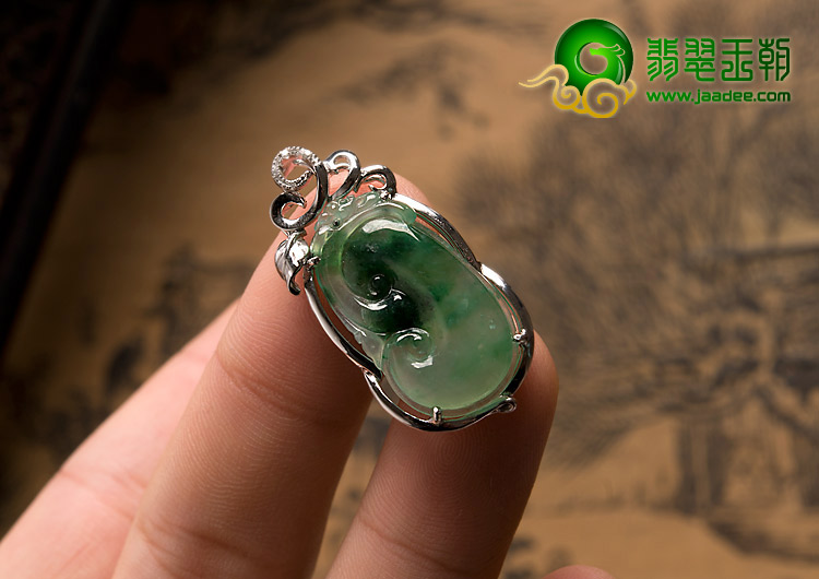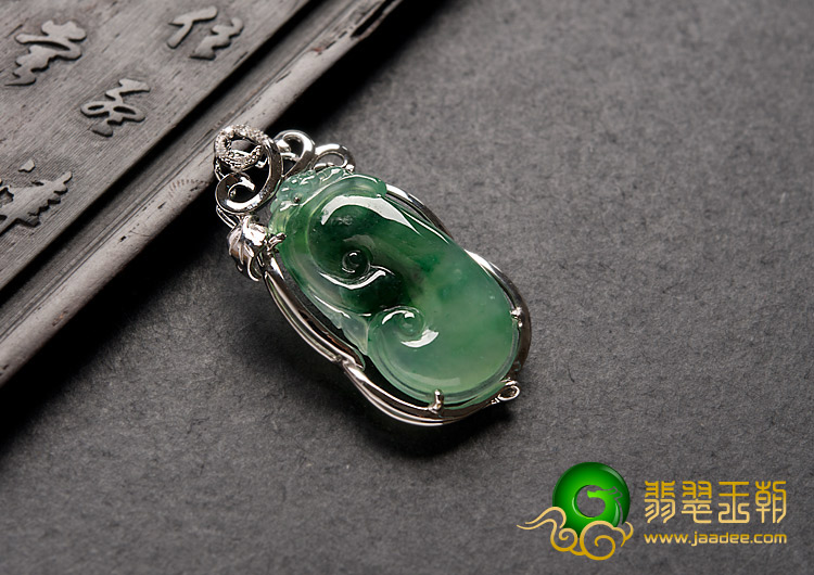 首页 >> 冰种飘花缅甸翡翠A货镶白金如意胸坠(真钻)