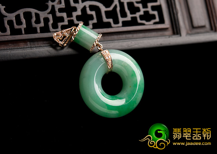 糯冰种翠色缅甸翡翠A货镶金平安扣胸坠(真钻)