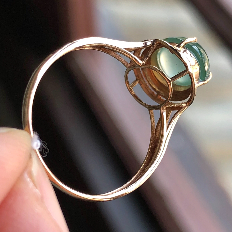 首页 >> 镶玫瑰金钻石冰种晴水翡翠戒指(14号)