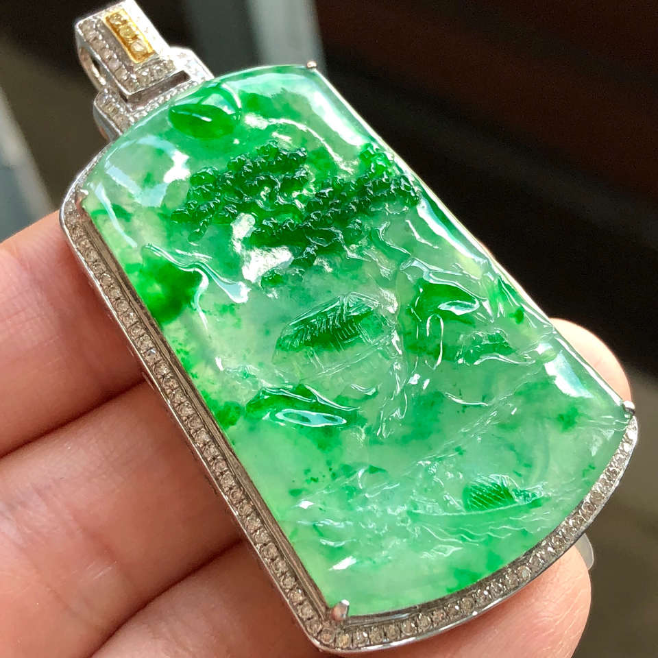 镶18K金钻石冰种飘阳绿翡翠山水牌胸坠