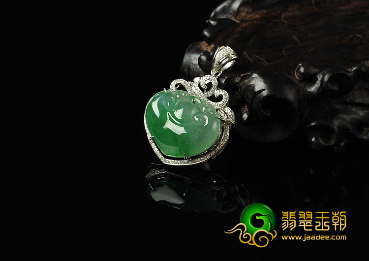 冰种翠色缅甸翡翠A货镶白金如意胸坠(真钻)
