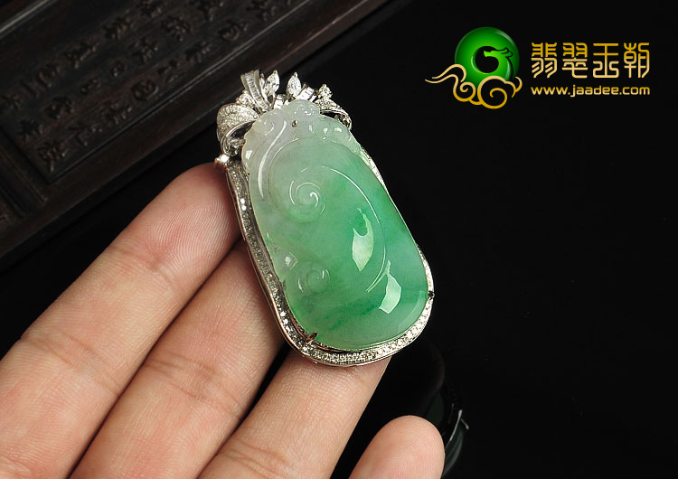 冰种翠色缅甸翡翠A货镶白金如意胸坠(真钻)