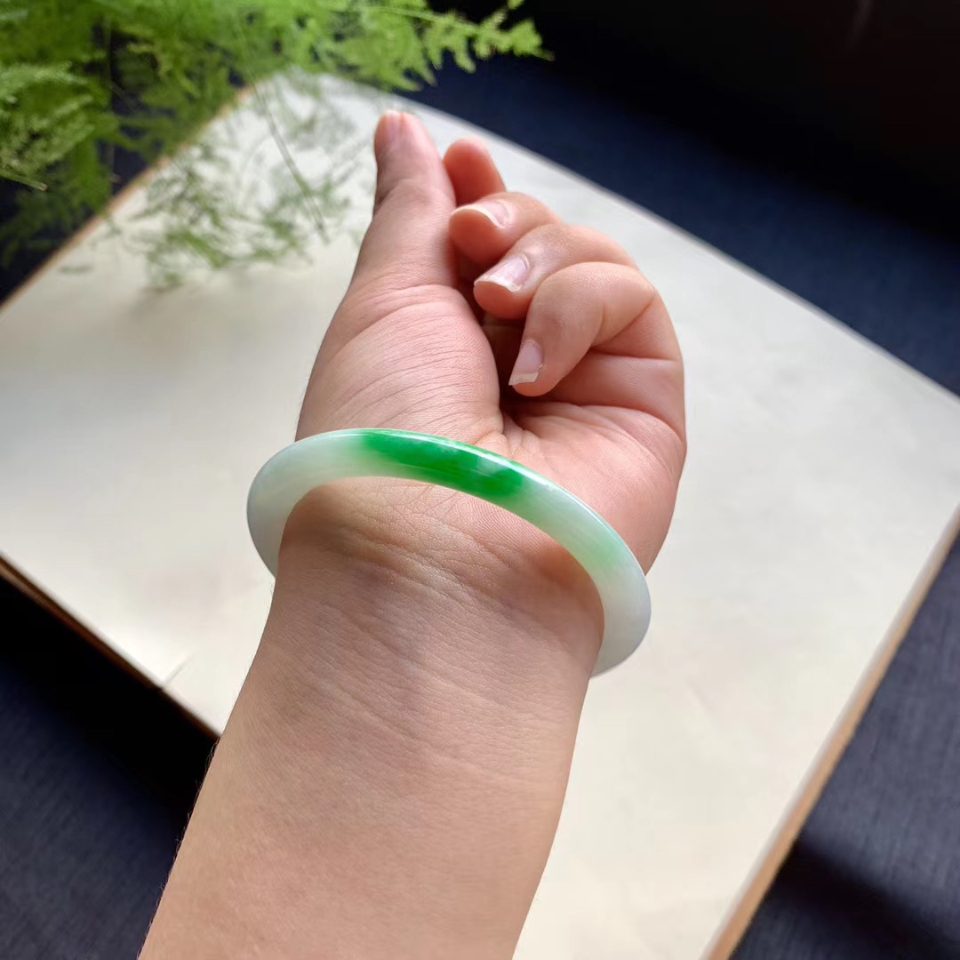 首页 >> (超值推荐)53.4mm糯冰飘阳绿圆条手镯翡翠