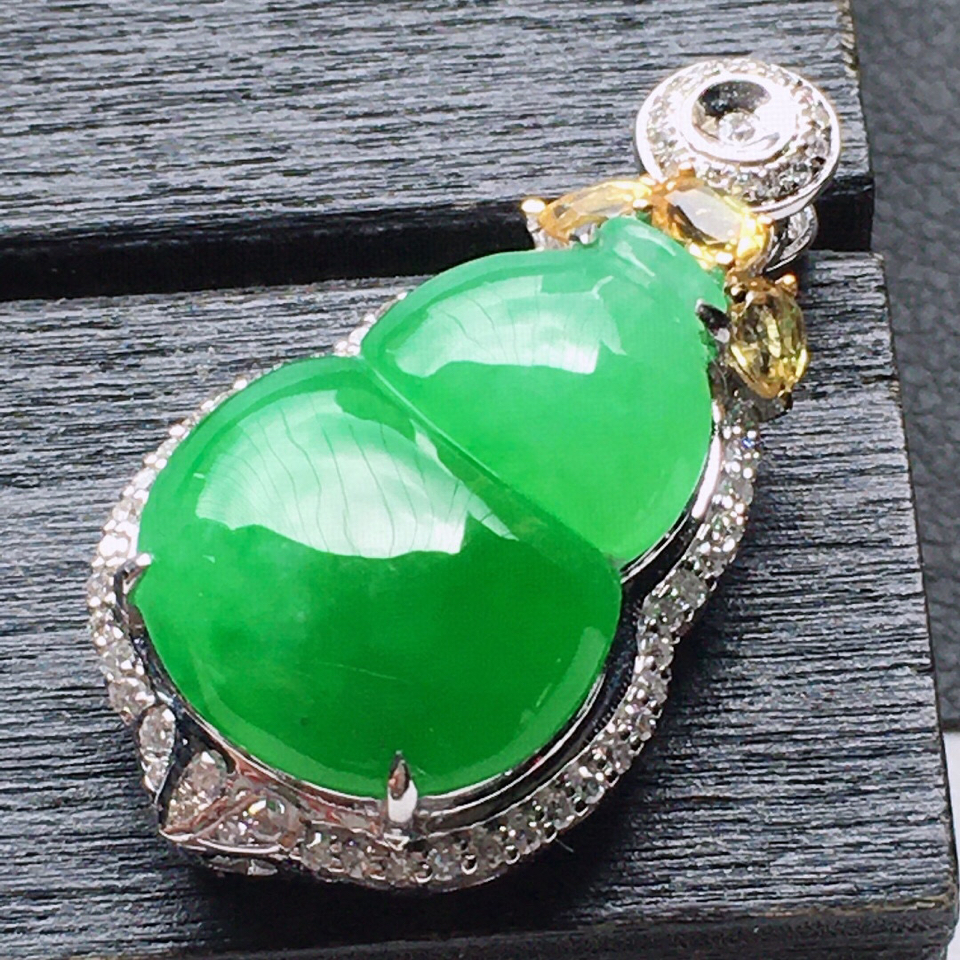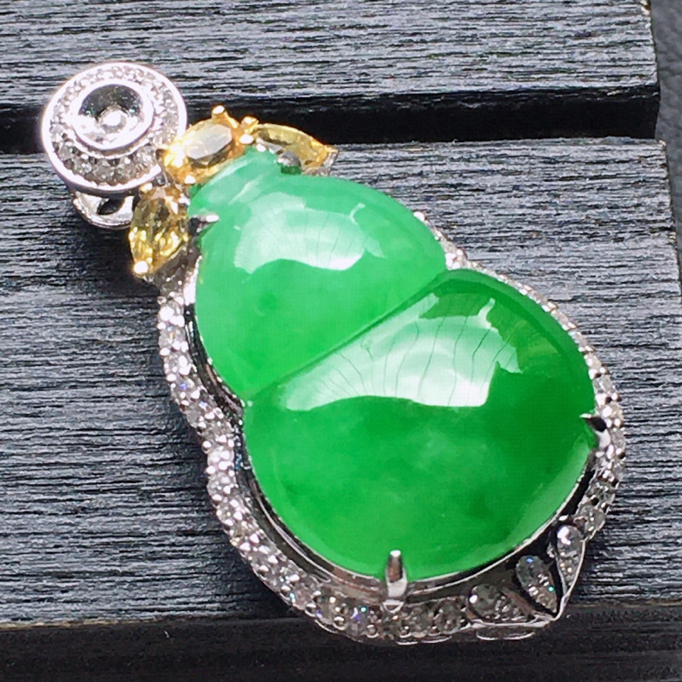 首页 >> 缅甸翡翠18K金伴钻镶嵌糯冰种满绿葫芦吊坠