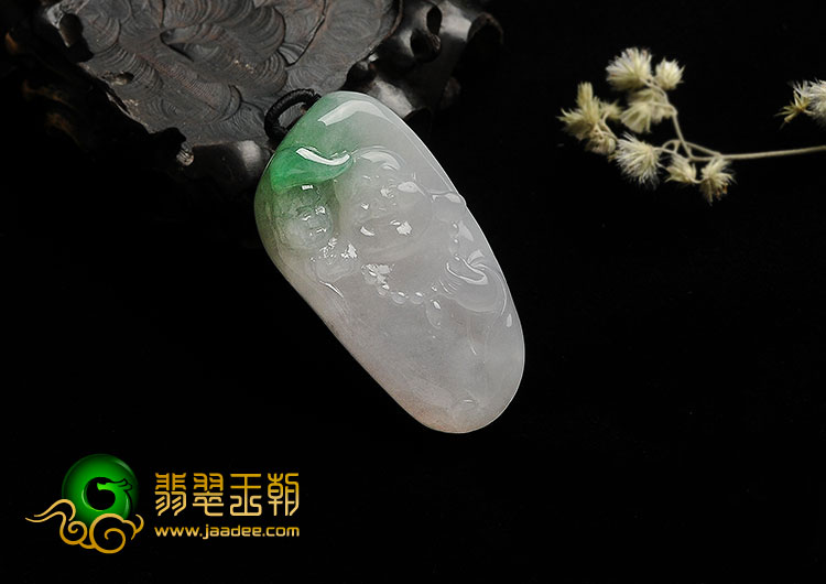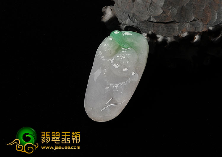 冰种带翠缅甸翡翠A货童子拜佛挂件