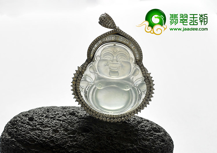 冰玻种晴水缅甸翡翠A货镶白金玉佛胸坠(真钻)