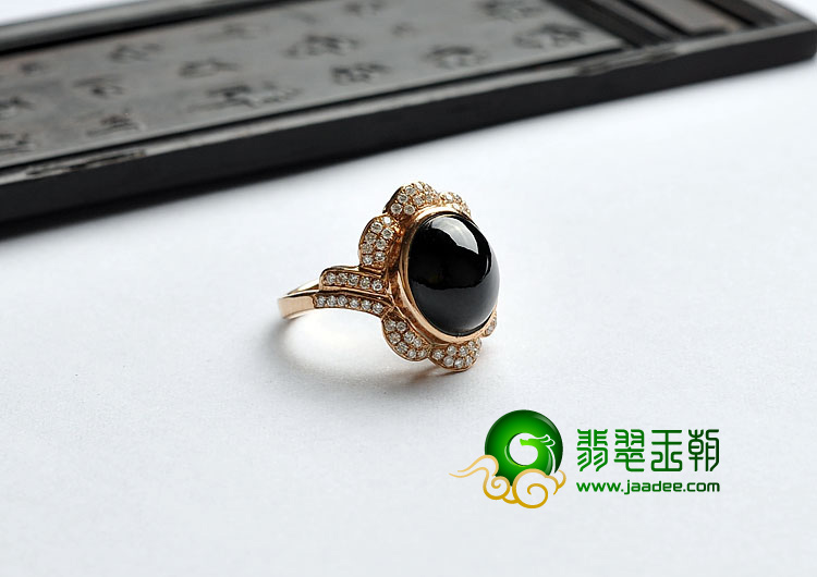冰种墨翠缅甸翡翠A货镶玫瑰金戒指(真钻)