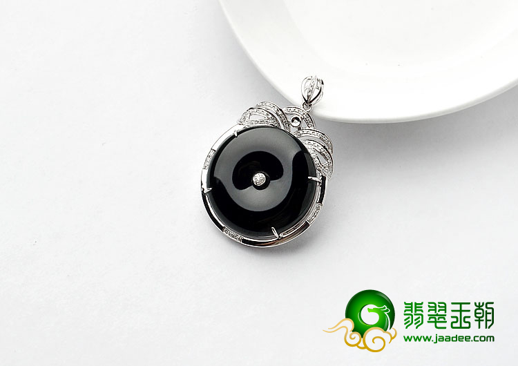 冰玻种墨翠缅甸翡翠A货镶白金平安扣胸坠(真钻)
