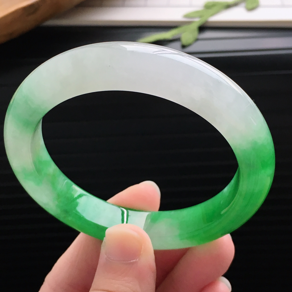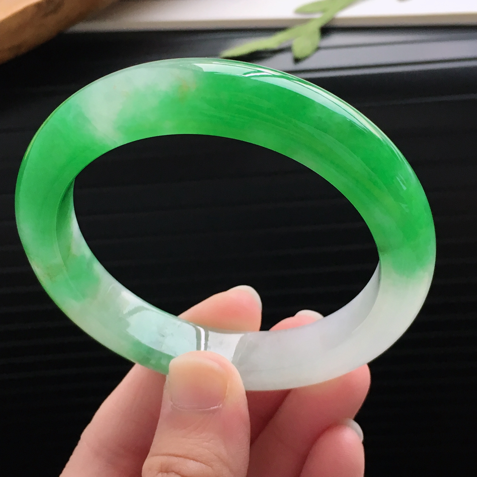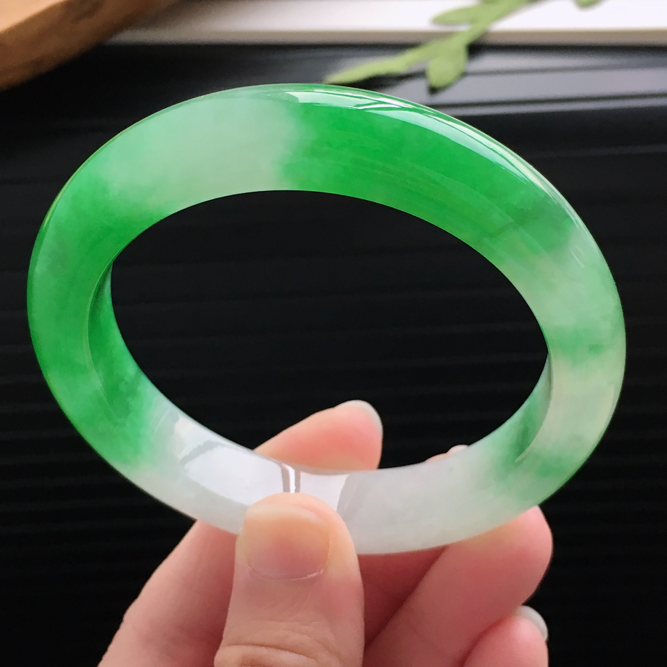 天然翡翠细糯种飘阳绿宽边手镯(55.9mm)