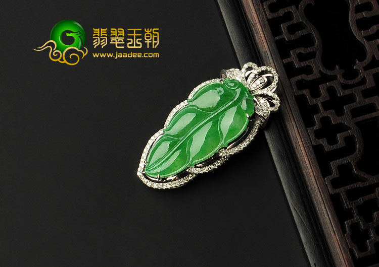 糯冰种翠色缅甸翡翠A货镶白金金枝玉叶胸坠(真钻)