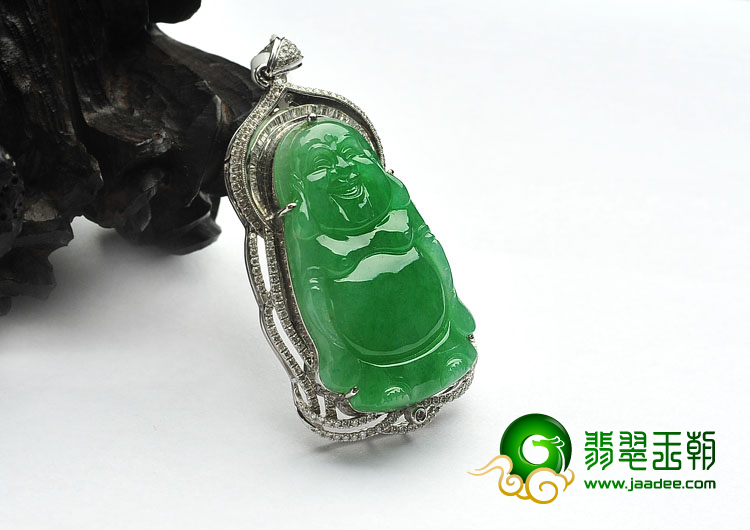 首页 >> (超值推荐)冰种阳绿缅甸翡翠A货镶白金满绿站佛胸坠(真钻)