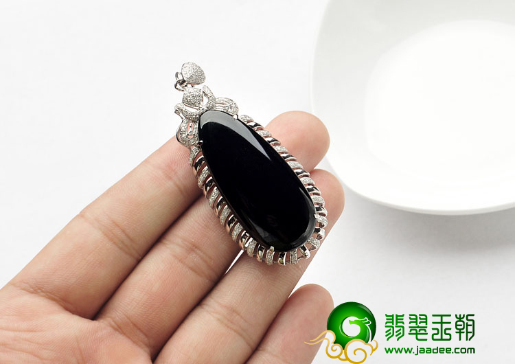 玻璃种墨翠缅甸翡翠A货镶白金水滴胸坠(真钻)
