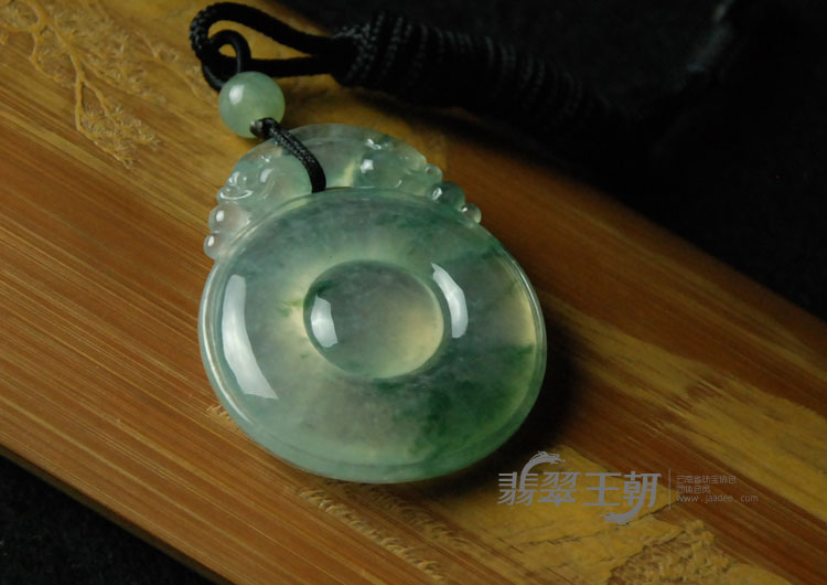 【必要说明】:冰种玉质结构致密,底子纯净细腻,通透莹润;些许深沉的暗绿色,有些水彩画作的感觉; 厚实饱满的美翠,用料非常讲究,品相极佳;凝洁美玉,没有进行繁复的雕刻,反而更能突显自然灵动之美;由蝙蝠和钱纹构成整个纹饰格局,蝙蝠因与“遍福”,“遍富”谐音,成为象征福气的吉祥图案。