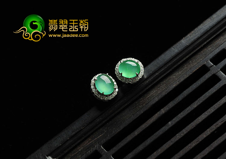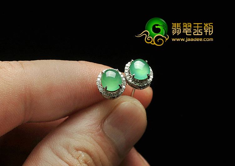 冰种绿晴水缅甸翡翠A货镶白金耳钉(真钻)