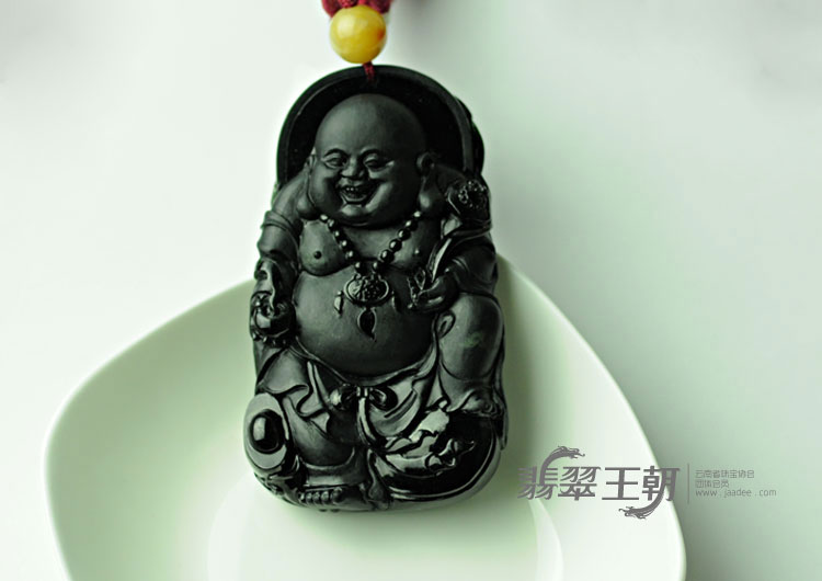 【必要说明】:质地纯、透的糯冰种,如丝缎般光滑细腻;墨翠是指颜色为纯黑色的翡翠。黑色代表了黑暗,同时也代表了正气;玉型厚装饱满,极有存在感;线条流畅,雕刻得不是很复杂,点到为止,具备完好的整体感;圆润饱满而又憨态可掬的弥勒佛,大腹便便,特别是面相,笑容可掬,佩之则静观世事起伏,笑看风起云涌。