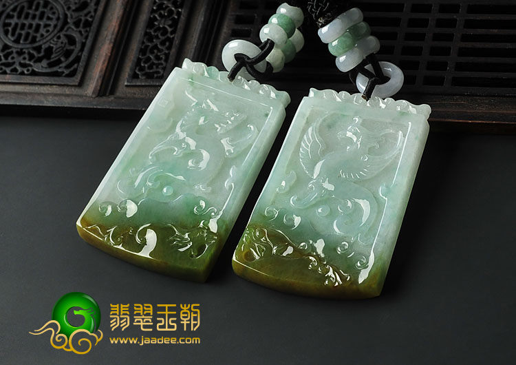 首页 >> 糯冰种褐黄翡晴水缅甸翡翠A货仿古龙凤牌挂件(一对)