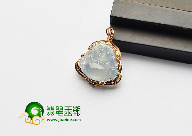 冰种淡晴水缅甸翡翠A货镶玫瑰金玉佛胸坠(真钻)