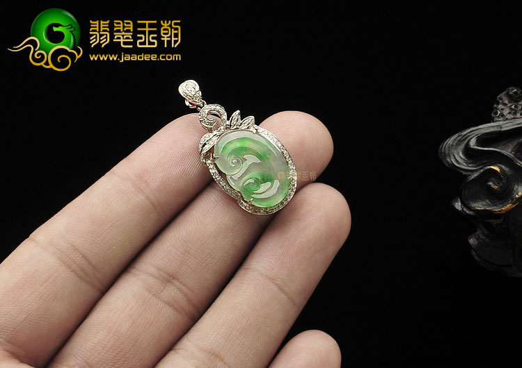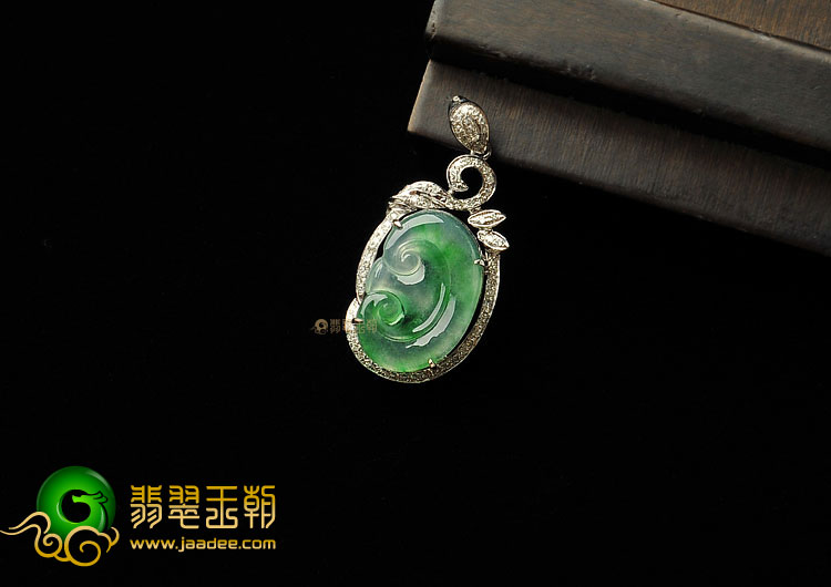 首页 >> 冰种飘翠缅甸翡翠A货镶白金如意胸坠(真钻)