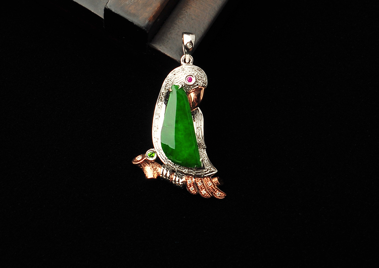 冰种翠色镶白金鹦鹉胸坠(真钻)