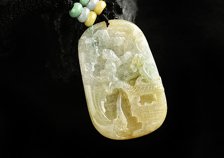 首页 >> 糯冰种黄翡飘花山水牌挂件