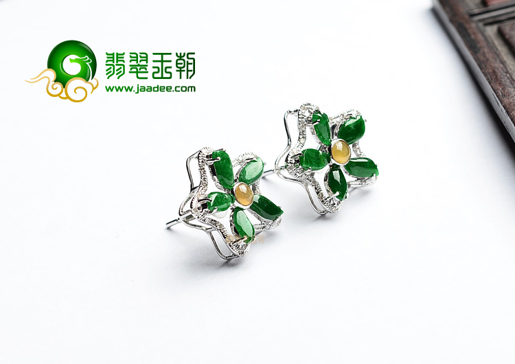 首页 >> (超值推荐)糯冰种黄加绿镶白金花型耳钉(真钻)