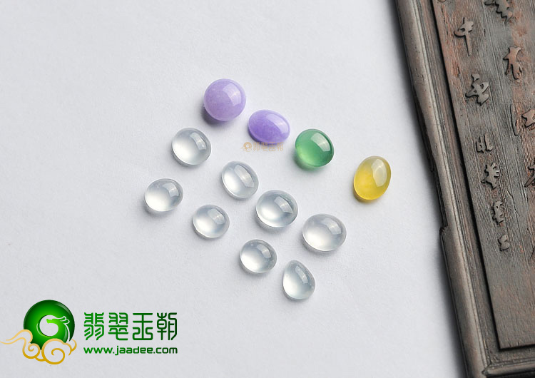 玻璃种无色/玻璃种晴水/糯冰种紫罗兰/冰玻种黄翡/戒面十二颗一起走,玉质莹润,水头好,无色清亮明净,紫罗兰色泽艳丽,黄翡轻柔均匀,晴水鲜灵干净,镶嵌后更为精致可人,晴水一颗有细小石纹,但瑕不掩瑜。