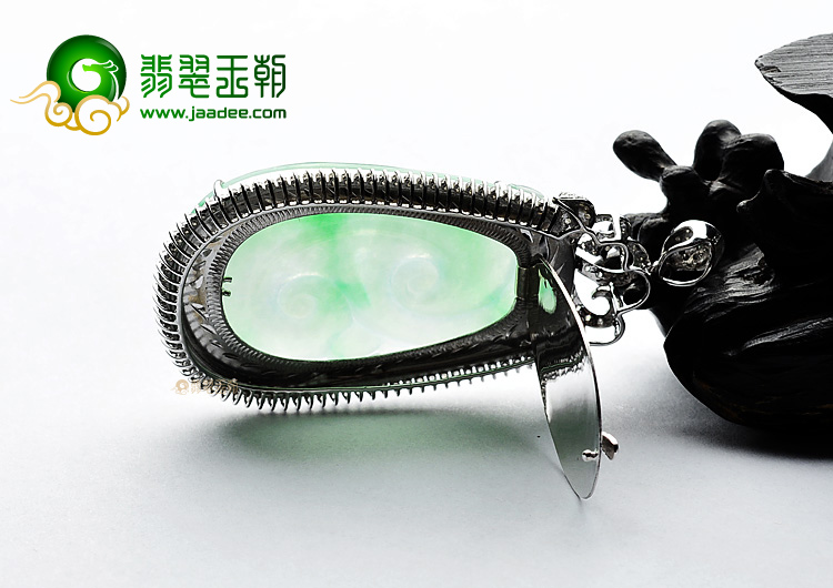 首页 >> (超值推荐)糯冰种苹果绿镶白金如意胸坠(真钻)