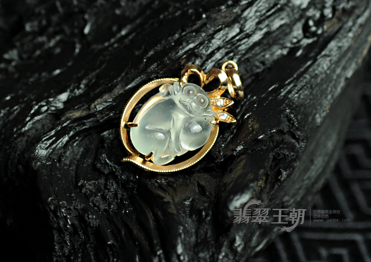 玻璃种强莹光缅甸翡翠镶玫瑰金灵猴献寿胸坠