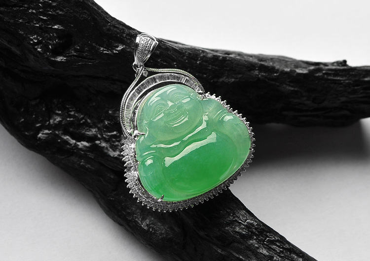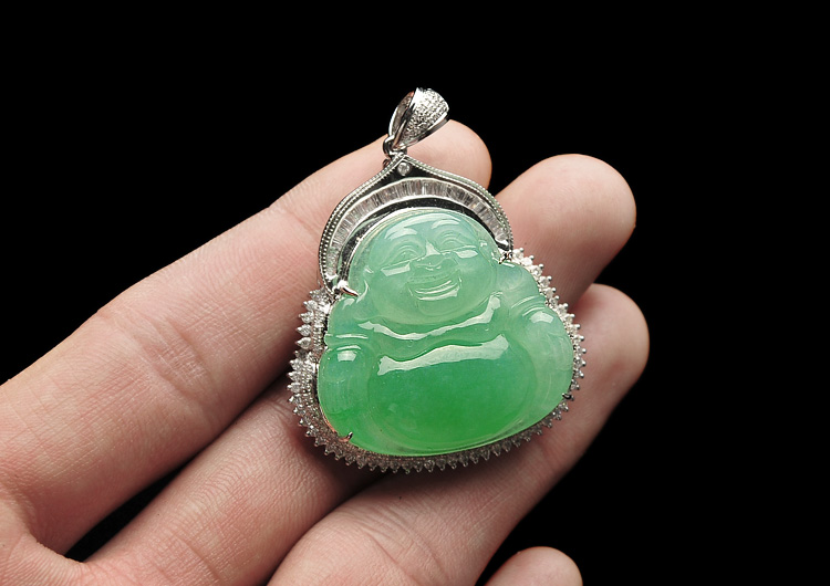 首页 >> (超值推荐)冰种绿晴水镶白金玉佛胸坠(真钻)
