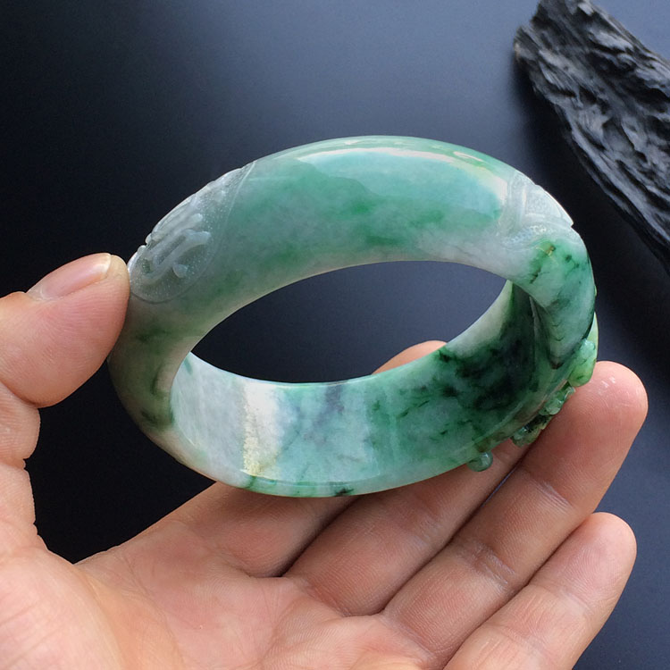 首页 >> 糯冰种飘花略带黄翡吉祥如意雕花手镯(58.6mm)