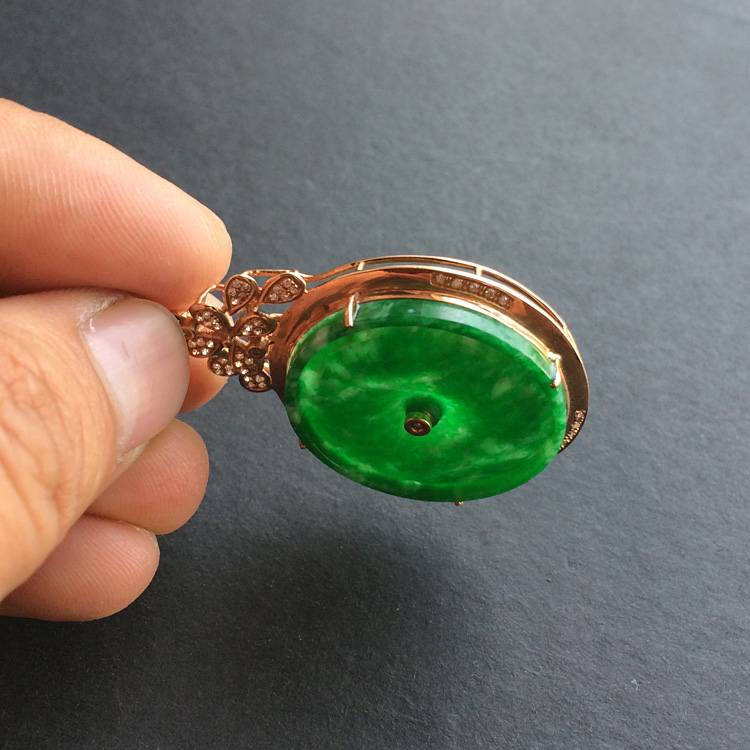 首页 >> (超值推荐)糯冰种阳绿镶玫瑰金钻石平安扣胸坠