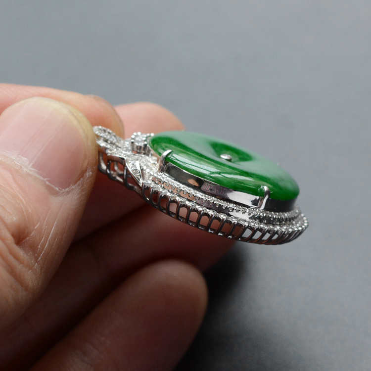 首页 >> (超值推荐)糯冰种翠色镶白金钻石平安扣胸坠