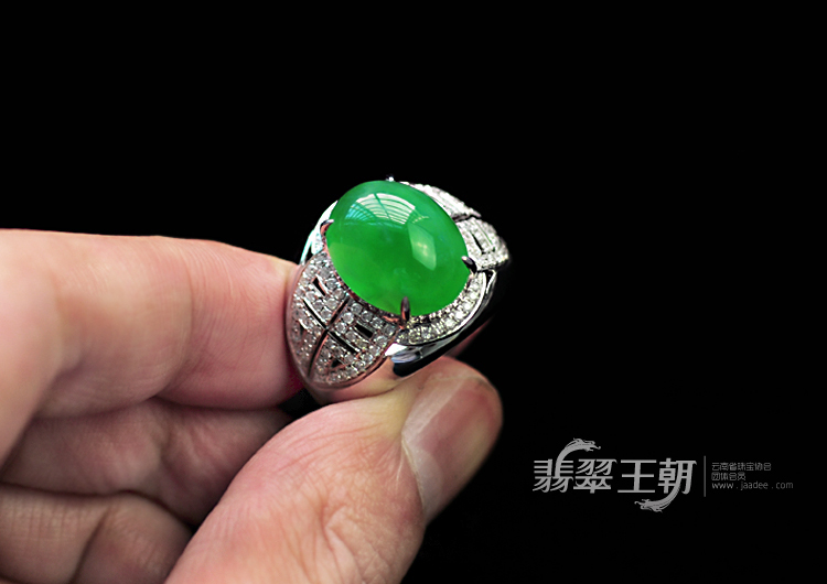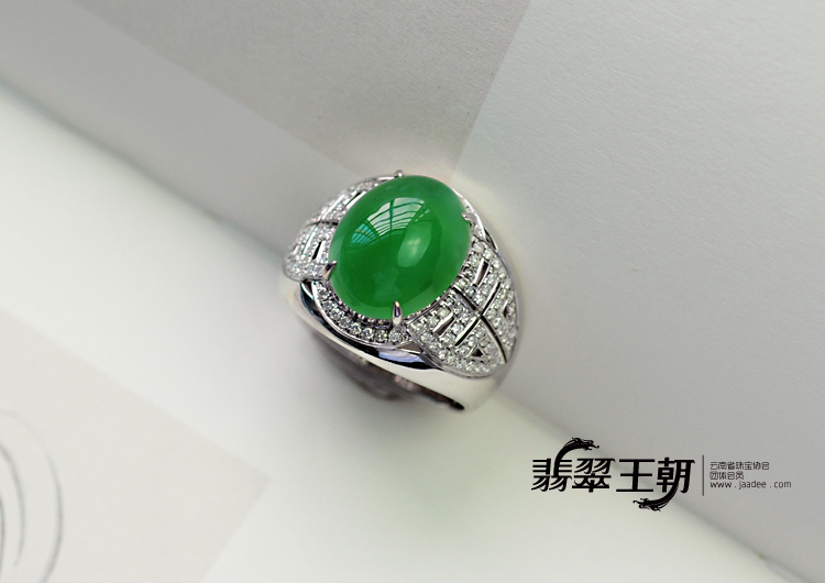 首页 >> 冰种阳绿满绿缅甸翡翠包白金镶真钻戒指