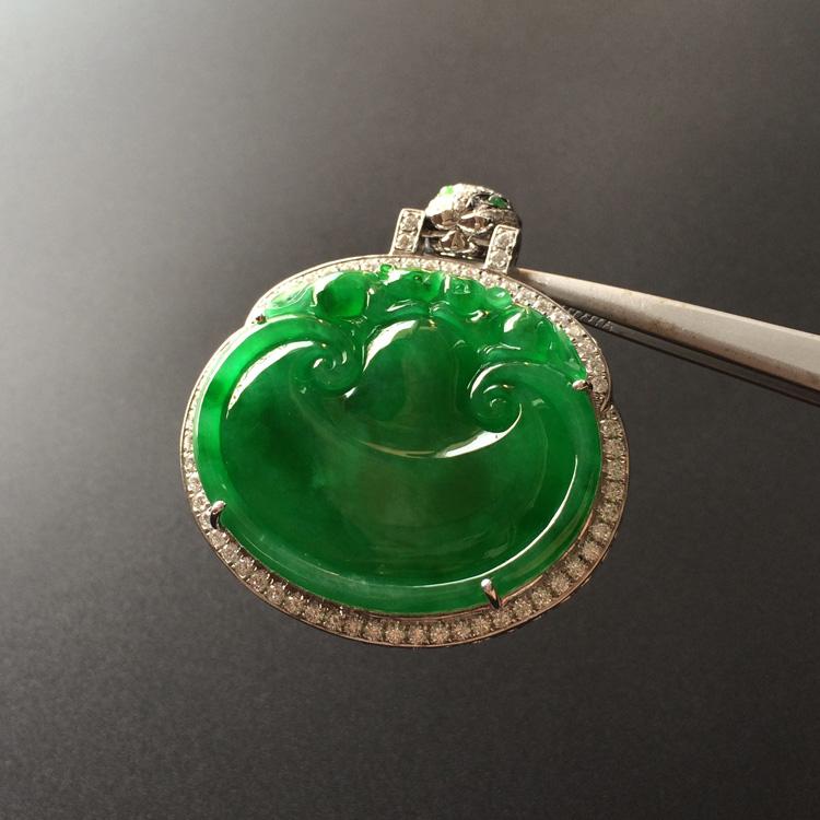 首页 >> (超值推荐)糯冰种阳绿镶白金钻石如意胸坠