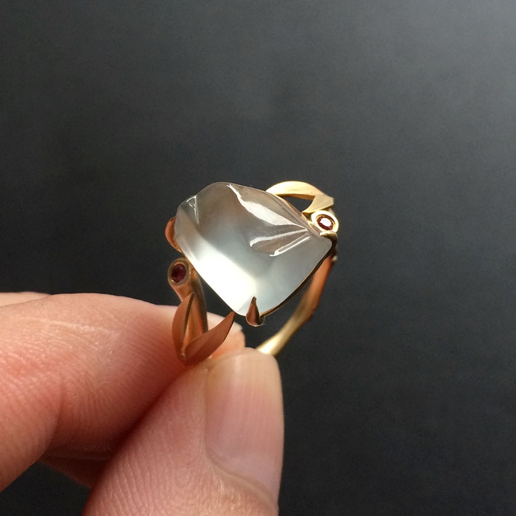 首页 >> (超值推荐)冰玻种淡晴水镶黄色金随形戒指