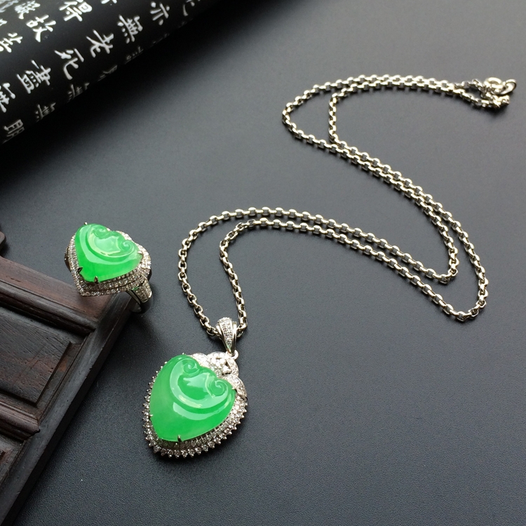 首页 >> (超值推荐)冰种苹果绿镶白金钻石如意胸坠/戒指一套