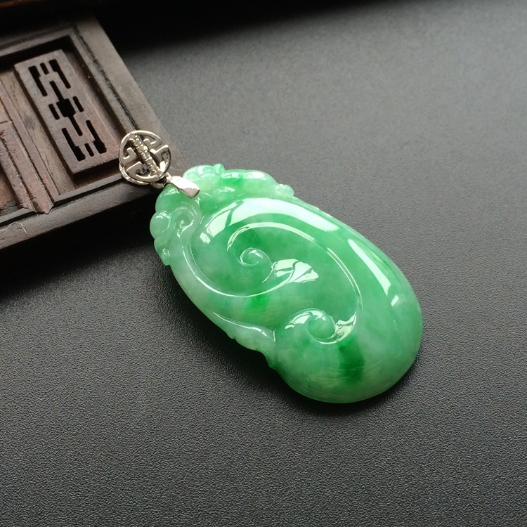首页 >> (超值推荐)糯冰种飘翠如意挂件(镶白金扣)
