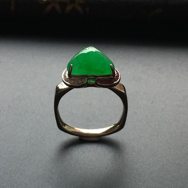 首页 >> (超值推荐)糯冰种阳绿18k金伴镶碎钻彩宝心形戒指