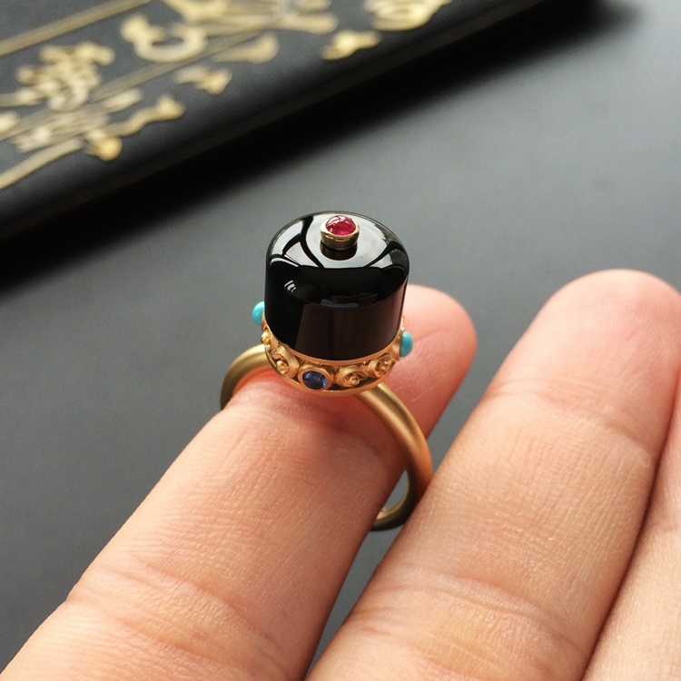 首页 >> 【玉雕名家施宗颖原创设计】(超值推荐)糯冰种墨翠镶黄18k金转经筒戒指